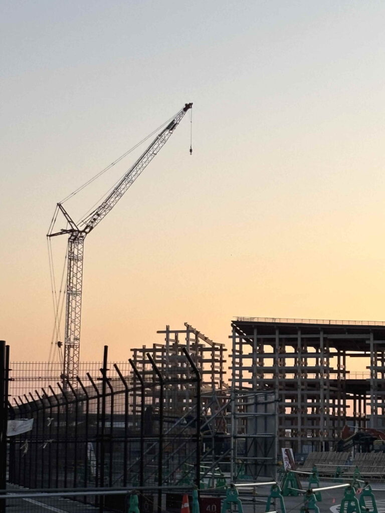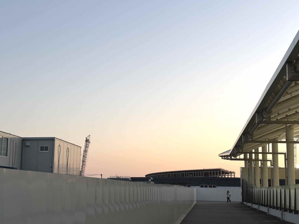 フェンスの向こうには工事関係者用のプレハブが多数立ち並んでおり、あらためて工事規模の大きさを感じる。